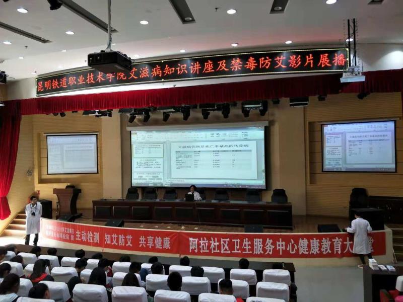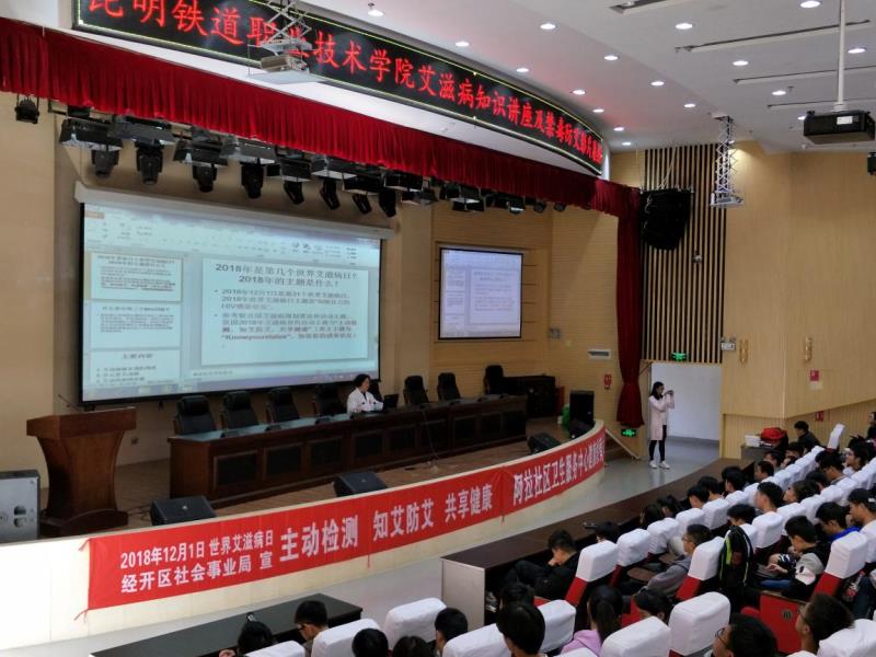 讲座由学院学生处副处长赵蕊老师主持,学生处医务室罗琼医生主讲、官渡区阿拉乡中医骨科医院的线路医生等医护人员也参加了本次活动,给学生发放了艾滋病宣传活动手册、答题小礼品及进行了签名活动。