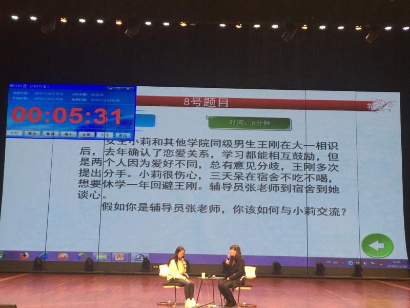 本次高校辅导员素质能力决赛分为两个阶段五个环节,第一阶段包括笔试(基础知识测试、网文和公文写作)、主题班会、案例分析三个环节。在主题班会环节,张羽寰老师凭借精彩生动的班会视频得到了专家评委们的一致好评,得到了小组最高分95分。同时在案例分析环节,张羽寰老师以清晰的思维、严谨的逻辑和丰富的学生工作经验对案例进行了深刻透彻的剖析,得到了评委们的一致认可,得到了小组为数不多的高分91.32分 ,学院第二次参加比赛,经验尚浅,但张羽寰老师凭借扎实的政治理论功底和熟练的学生工作能力脱颖而出,在第一阶段的比拼中获得了234.65分的高分,在78名参赛选手中排名13,顺利晋级第二阶段的比赛。第二阶段比赛包括谈心谈话和理论宣讲两个环节。在谈心谈话环节中,张羽寰老师运用专业的心理学知识和丰富的学生工作经验与助演学生积极互动,妙语连珠,圈粉无数。在理论宣讲环节,张羽寰老师用全面深刻的政治理论,对宣讲主题进行深刻剖析,以情动人、娓娓道来,赢得了在场观众的阵阵掌声。