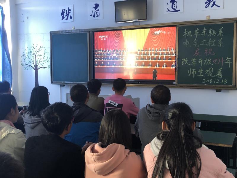 图为机车车辆系与电气工程系组织教师和学生观看庆祝改革开放四十周年大会