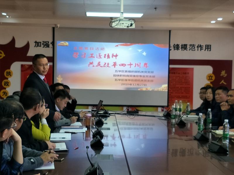 为全面贯彻落实党要管党、全面从严治党的要求以及加强学院党支部建设,2018年12月27日14:00五华区委组织部机关党支部、五华区莲华街道机关党支部、新葡萄AMG官方网站商贸信息专业党支部在新葡萄AMG官方网站睿知楼开展《学习工匠精神,共庆改革开放四十周年》主题党日活动。