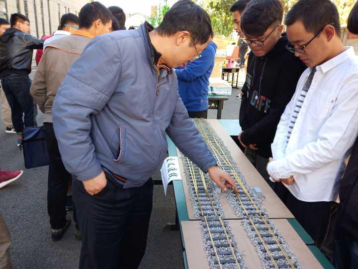 本次毕业设计主要有铁路轨道(含道岔)、铁路桥梁、铁路隧道、铁路路基四个课题,每个课题有两组。16级铁道工程技术专业的学长们根据下发的施工图纸,历时五周,精心制作了8个毕业设计模型及配套的施工组织设计。学长们向到场参观的师生详细讲解设计意图,并邀请参观者对其模型投票,这不仅仅是一场比赛,也是一场专业知识的交流与碰撞!