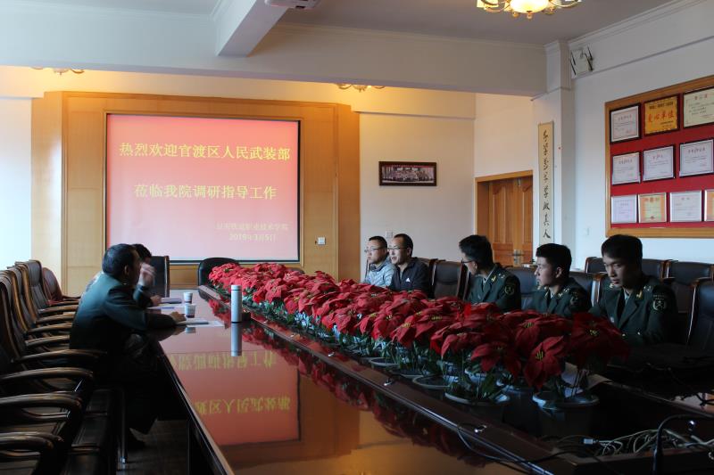 2019年3月5日,官渡区人武部副部长赵永斌同志、参谋鲁子义同志到我院调研指导工作。学院学生处(武装部)负责人李徕同志,学生处工作人员及我院军事爱好者协会运营管理团队负责人参加了会议。