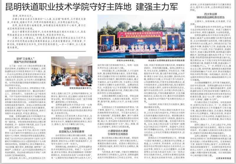 2019年4月2日,《昆明日报》专题报道学院思想政治工作题为《新葡萄AMG官方网站守好主阵地 建强主力军》的文章,文章指出新葡萄AMG官方网站正结合习近平总书记在学校思想政治理论课教师座谈会上发表的重要讲话,不断探索、不断实践,用铿锵有力的步伐,用科学发展的理念,一步一个脚印,办人民满意的教育。专题报道从坚持“三全育人”,理直气壮开好思政课;加强师资建设,自觉做为人为学的表率;小课堂结合大课堂,引导学生立鸿鹄志;四大专业群,铸就铁路品牌和责任担当共四个板块就学院思想政治教育工作作了详细阐述。