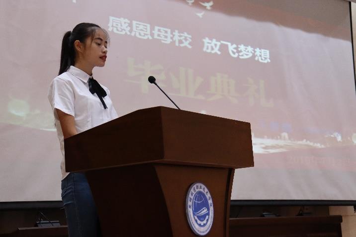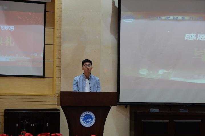 2017级学生代表王梦巍为毕业的学长们送上满满的祝福:“是学长们用你们的亲身经历让我们懂得,一个人只有越努力,才能越幸运。教会我们认真做事,真诚做人,使我们懂得感恩与回报……。你们一定还记得以升楼、天佑楼里开过的每一次班会;实训室里的每一次动手操作;团学会里,你们带领我们举办的一次次活动;食堂里阿姨抖手的饭菜……而我们,也会用心记住你们每个人的样子,记住那些有学长们陪伴着的日子。老师为我们的成长播下了种子,是母校给我们提供了成长的沃土。莫愁前路无知己,天下谁人不识君,我们相信优秀的你们,热爱生活的你们,无论多么困难,也都会用优秀的成绩回报大家的期待,回报母校的培养。”