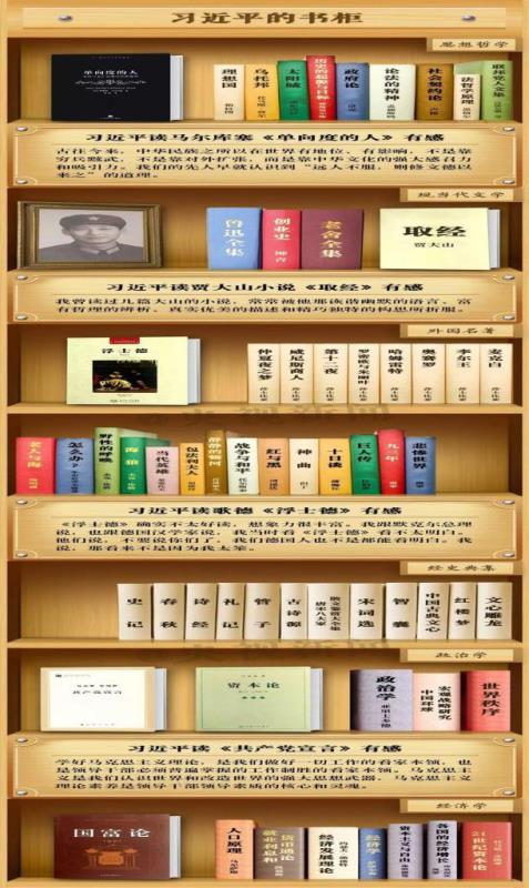 雷榕生回忆道:近平这个读书方法,简单来说,就是他经常是以看一本书为主,同时又寻找相关的书籍作为佐证,不断地扩展阅读书中的知识。比如他看中国历史,就是先以范文澜的《中国通史简编》为主要读本来学习,但在学习中发现史学家的不同观点时,就以钱穆、吕振羽等不同版本的中国历史书籍来互相印证、互相对比,深入理解。这样学到的历史观点,是一个立体、全面的观点。既掌握了它们之间的联系与不同点,也养成了从不同角度观察分析问题的习惯。