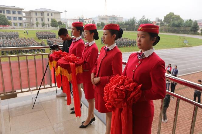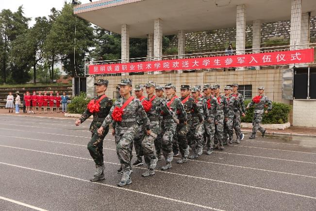 副书记张学云、副院长谢文为入伍学生佩戴大红花,19级全体新生整齐列队,热烈欢送入伍同学。领导、老师的嘱咐,家长、同学的叮咛,一句句感人肺腑的话语烙印在入伍学生的心中。