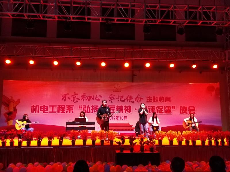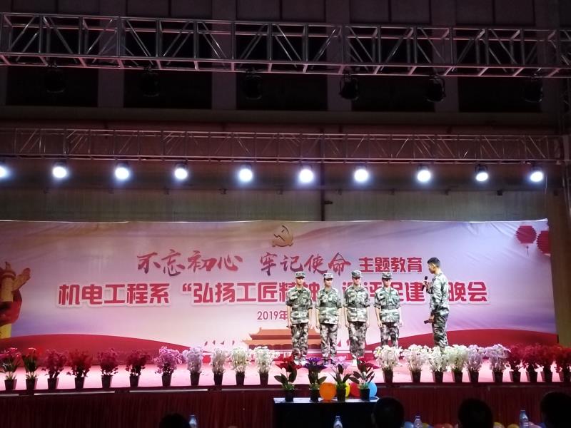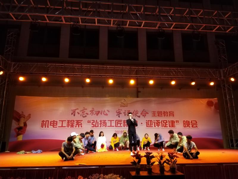 为迎接我院即将到来的人才培养工作评估,营造浓厚校园文化氛围,厚植学生的爱校情怀。机电工程系于10月31日晚在南院体育馆内举办了“弘扬工匠精神 迎评促建”晚会。学院宣传统战部部长赵伟、学生处处长杨华、机电工程系主任许剑伟、机电工程系书记张永明以及机电工程系的辅导员和班主任参加了此次晚会。
