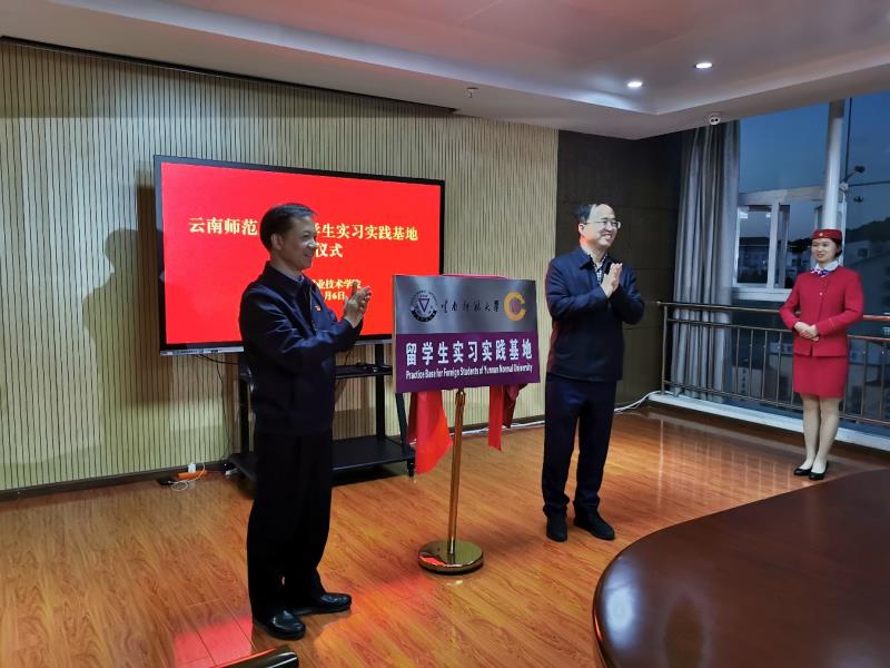 在师生热烈的掌声中,云南师范大学校长蒋永文和我院党委书记张志宏书记共同为“留学生实习实践基地”揭牌,其他参会领导共同见证。
