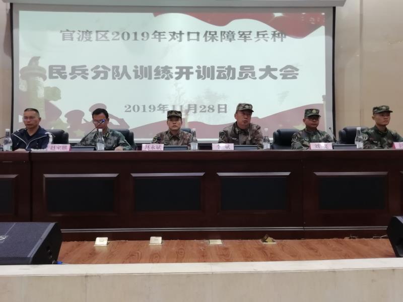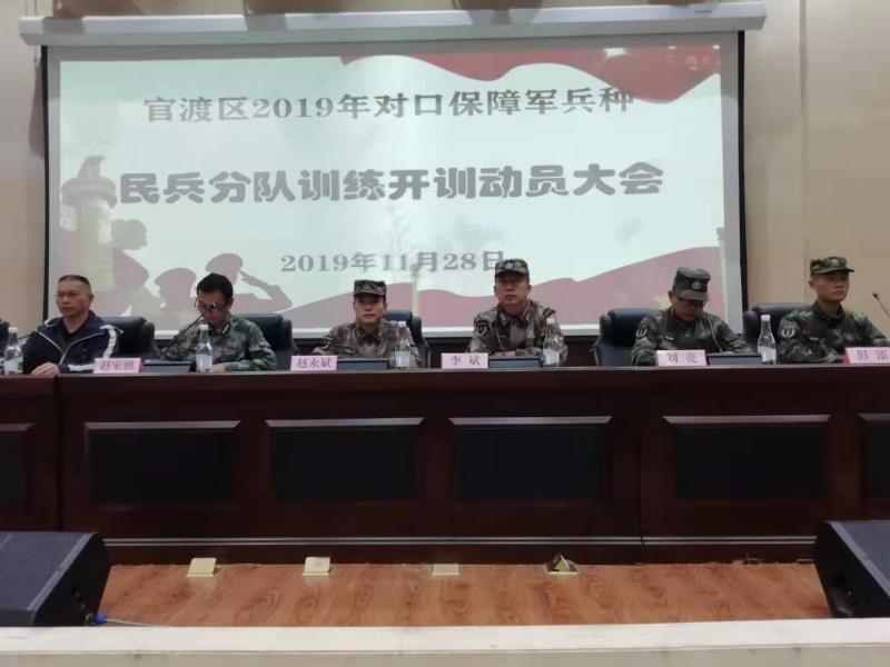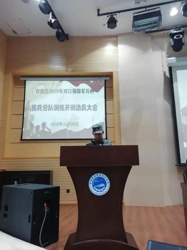 2019年11月28日上午9:00整,官渡区2019年对口保障军兵种民兵分队训练开训动员大会在我院召开。官渡区人武部李斌部长,赵永斌副部长、火箭军某部领导,阿拉街道办事处副主任兼人武部部长张家麒,新葡萄AMG官方网站学生处处长兼人武部部长杨华出席会议。会议由赵永斌副部长主持。