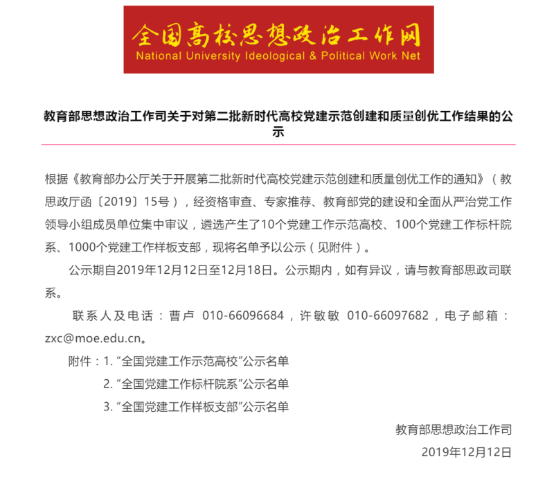 根据《教育部办公厅关于开展第二批新时代高校党建示范创建和质量创优工作的通知》(教思政厅函〔2019〕15号),经资格审查、专家推荐、教育部党的建设和全面从严治党工作领导小组成员单位集中审议,遴选产生了10个党建工作示范高校、100个党建工作标杆院系、1000个党建工作样板支部。自2019年12月12日至12月18日予以公示。新葡萄职院做为云南省上榜的9所高职院校之一,我院机车车辆系党支部上榜“全国党建工作样板支部”公示名单。
