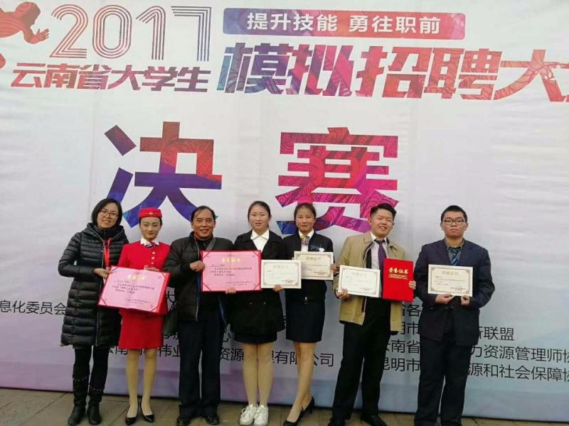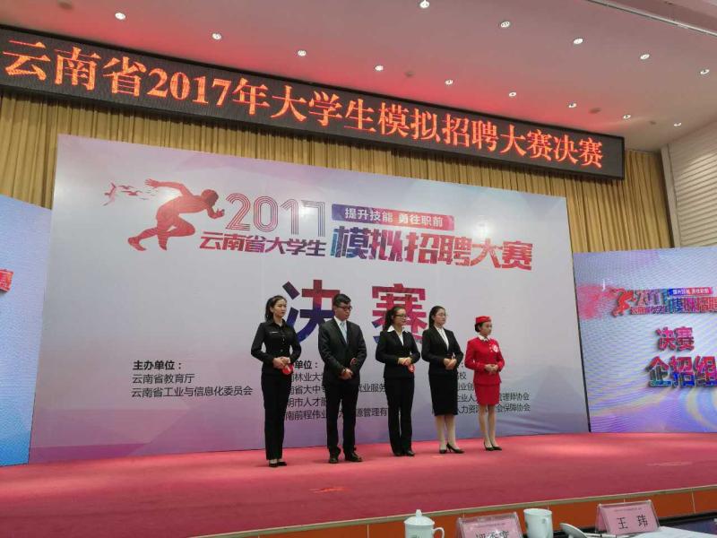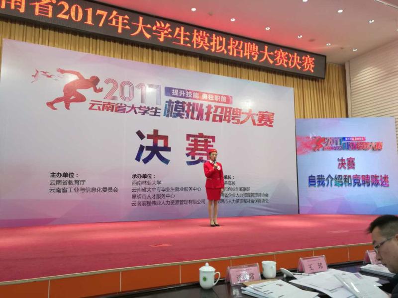 为深入贯彻落实党的十九大精神,实现毕业生更高质量和更充分就业,2017年12月22-24日,我院参加了在西南林业大学举行的“云南省2017年大学生模拟招聘大赛”复赛和决赛。最终何丹同学以微弱差距荣获“企招组”银奖、韩宗泽获得“事招师范组”铜奖及云南省十佳最佳人气王、李杰荣获“公招组”铜奖、邢茜获得“事招组”铜奖、李浩然获得“HR”铜奖。同时我院是唯一进入决赛的专科院校,何丹是唯一的一个获得银奖的专科层次选手。