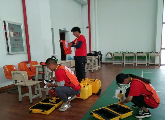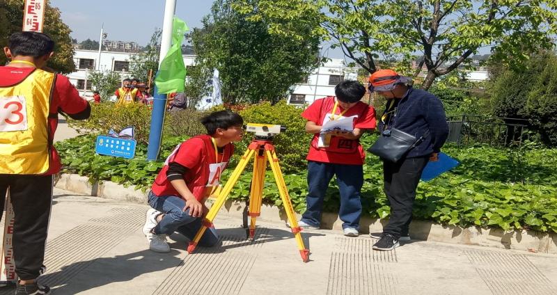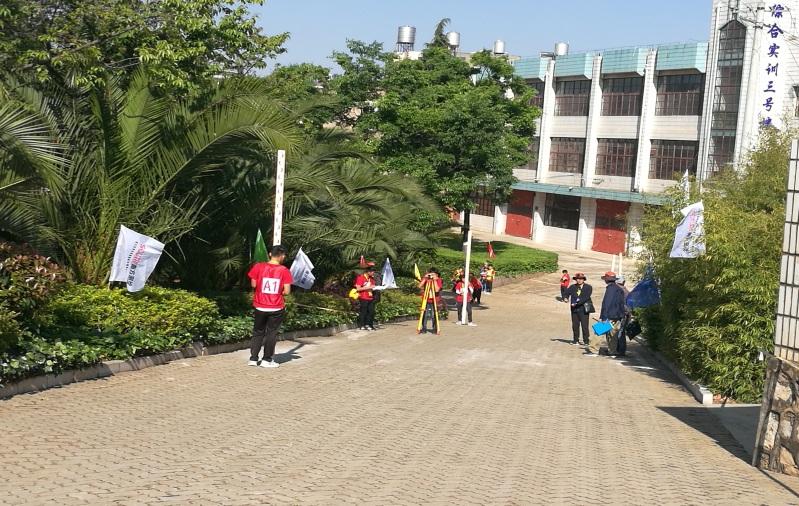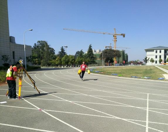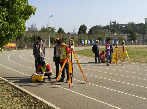 一切准备就绪后,比赛开始了,我们可以看到每个参赛队由四名队员组成,他们快速的将仪器架好、调准、测量,动作十分娴熟,与此同时,另一名队员手拿棱镜和脚架迅速找到下一个测站点,配合队友测量。