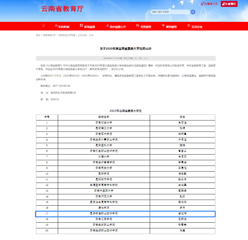 近日,云南省教育厅发布《关于2025年度云南省最美大学生的公示》,20名最美大学生名单出炉。新葡萄学生缪旭梅获评“2025年云南省最美大学生”称号。这位来自云南曲靖的姑娘,以自强不息的成长故事,展现了新时代青年的担当与奋斗精神。