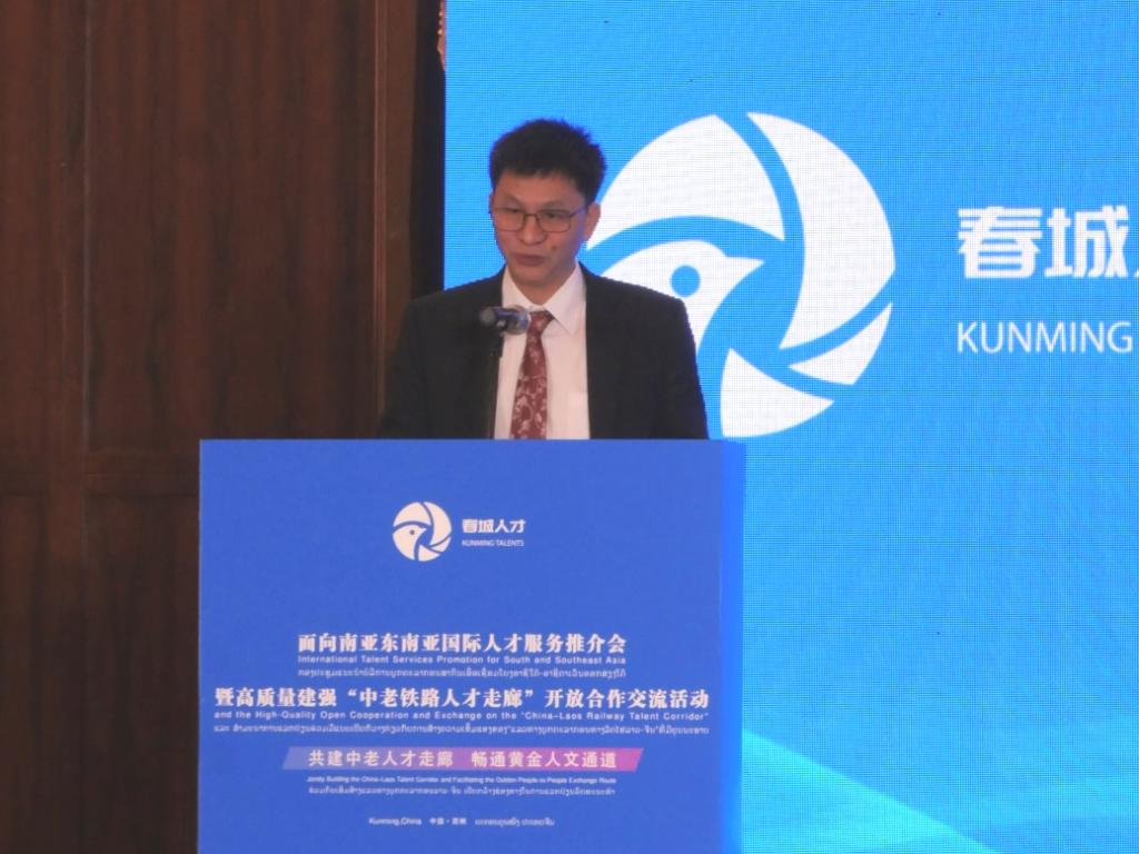 活动现场亮点纷呈,市委常委、组织部部长普利锋出席活动,市委常委、市人民政府副市长陈凯杰,老挝驻昆明领事馆总领事邦当·巴萨帕迪出席活动并致辞。学院党委副书记、院长李瑞林代表学院出席活动。学院特邀嘉宾—老挝铁职院院长本亚里在活动中以《携手共建跨境人才交流合作机制 为区域发展提供坚实技能人才支撑》为题作主旨发言。他对学院在老挝铁职院的建设发展过程中做出的卓越贡献表示的由衷的感谢,从培养首批40名老挝铁职院师资开始,到制定老挝铁道技术技能人才培养标准和6个铁道专业的所有教材,奠定了老挝铁职院顺利起步、向老挝铁路事业输送本土人才的坚实基础。他希望,中老双方能共建区域性人才培养高地,共同探索建立面向更广阔区域的技能人才培养网络,将合作从铁路技术拓展至物流、商贸、旅游服务等更多领域。