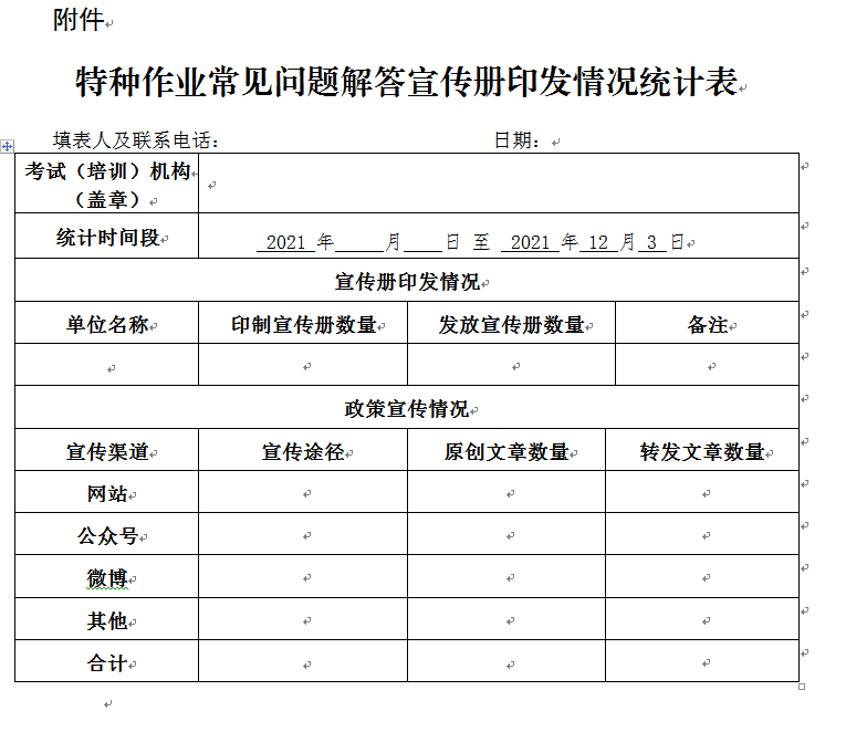 根据要求,请于12月3日前将《特种作业常见问题解答宣传册印发情况统计表》(见附件)电子文档报市局行政审批处,由市局统一汇总上报省考试中心,联系人:李琳、符云云,联系电话:0871-63149859,邮箱45400725@qq.com。