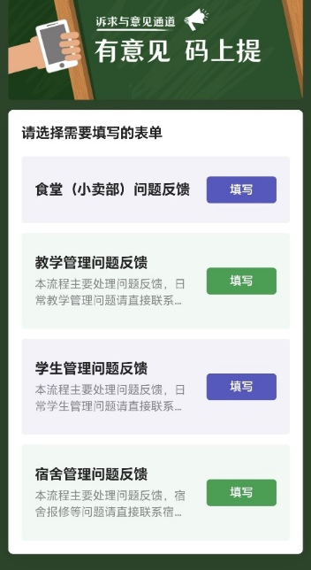 2024年10月,学校启用“有意见,码上提”这一意见和建议反馈通道。为进一步畅通学校与同学们之间的沟通渠道,倾听同学心声,广纳意见建议,及时有效解决实际问题,现新增了“教学管理问题反馈、学生管理问题反馈、宿舍管理问题反馈”三个板块,切实帮助大家解决学习生活中的烦恼和问题。