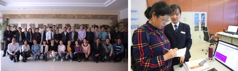李瑞林院长一行在集团公司人员陪同下参观了调度所,高铁室张自宝详细介绍了云南高铁的运营现状、调度所的生产调度情况。