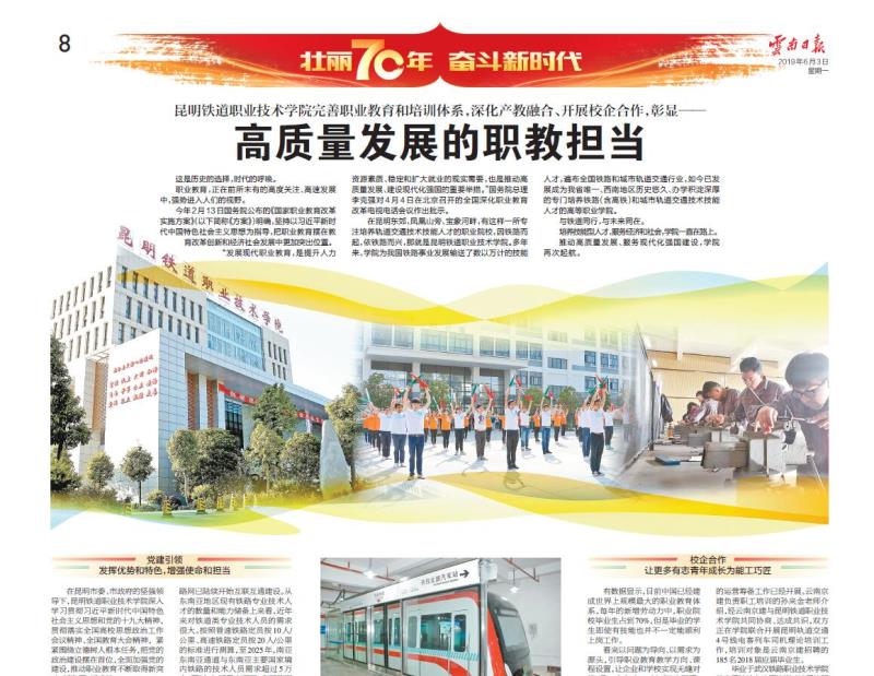 2019年6月3日,《云南日报》专题报道学院职业教育改革题为《新葡萄AMG官方网站完善职业教育和培训体系,深化产教融合、开展校企合作,彰显高质量发展的职教担当》的文章,文章指出,多年来,新葡萄AMG官方网站为我国铁路事业发展输送了数以万计的技能人才,遍布全国铁路和城市轨道交通行业,如今已发展成为西南地区历史悠久、办学积淀深厚的专门培养铁路(含高铁)和城市轨道交通技术技能人才的高等职业学院。专题报道从党建引领,发挥优势和特色,增强使命和担当;前置培训,为用人单位输送“毕业就上岗、上岗就能用”的可塑之才;订单培训,全方位对接需求、多形式进行教学,实现更高质量就业;校企合作,让更多有志青年成长为能工巧匠;职业技能鉴定,在发挥学院社会服务职能方面进行探索与实践共五个板块就学院职业教育工作作了详细阐述。