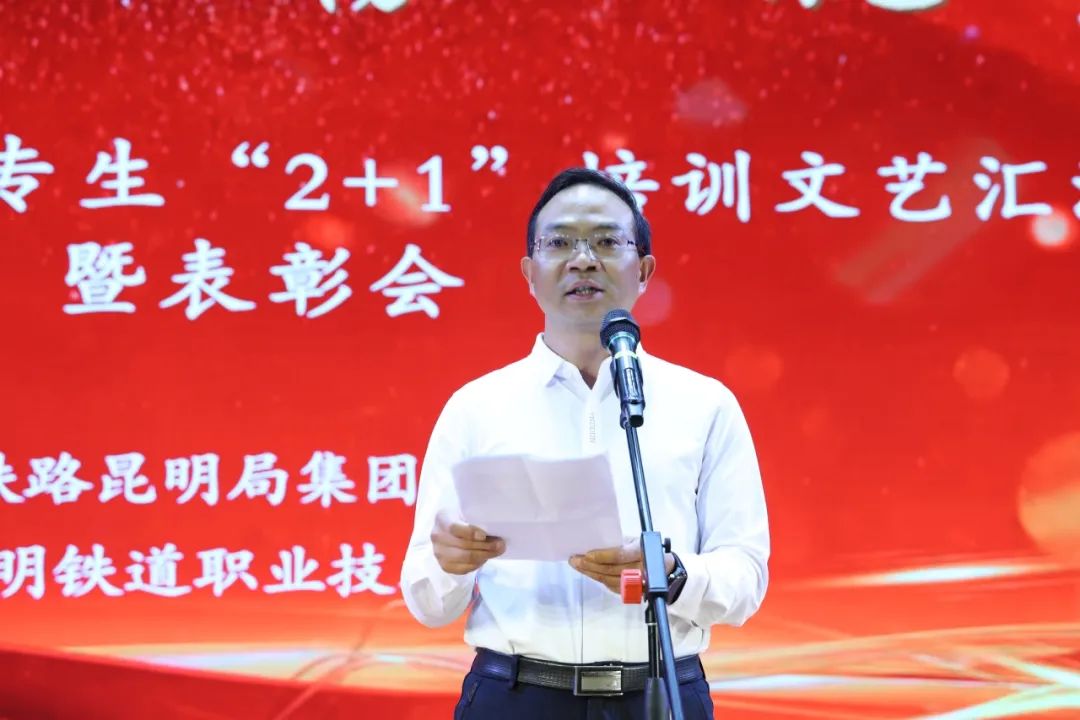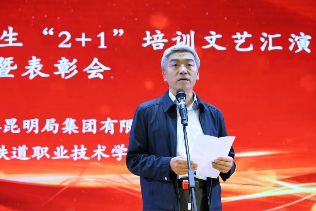 李德明副总经理在致辞中表示,此次晚会是学校和昆明铁路局共同努力成果的展示,也是校企深度合作、共育人才的生动体现。技能人才是铁路事业发展的基石,是集团公司的宝贵财富,实施“2+1”培养模式,有利于深化校企合作和产教融合,促进学生成长发展,实现从学生到员工的有利衔接。铁路行业高新技术装备众多、生产任务繁重、组织纪律严格,希望同学们珍惜机会、努力学习,培养吃苦耐劳、刻苦钻研、遵章守纪的优良品格,树立终身学习理念,把学习作为一种责任和生活方式,让勤奋学习成为青春远航的动力,让增长本领成为青春博击的能量,尽快顺利走入昆明局这个大家庭,为铁路运输事业贡献青春和力量。
