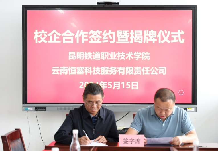 签约仪式上,学院副院长邓正均与与云南恒塞科技服务有限责任公司总经理路里签署“校企合作协议”。