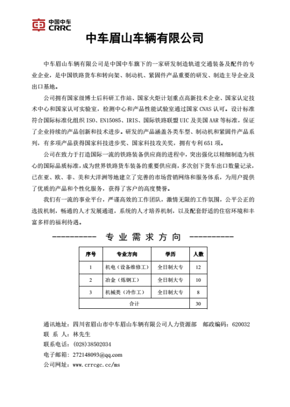 现将中车眉山车辆有限公司招聘事宜通知如下: