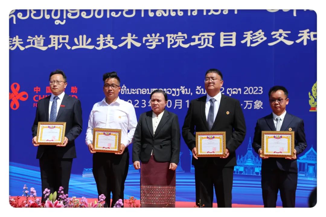 老挝教育与体育部组织司司长宣读了老挝政府对该项目做出杰出贡献中方单位的表彰决定,新葡萄教师罗海云代表学校上台领奖。