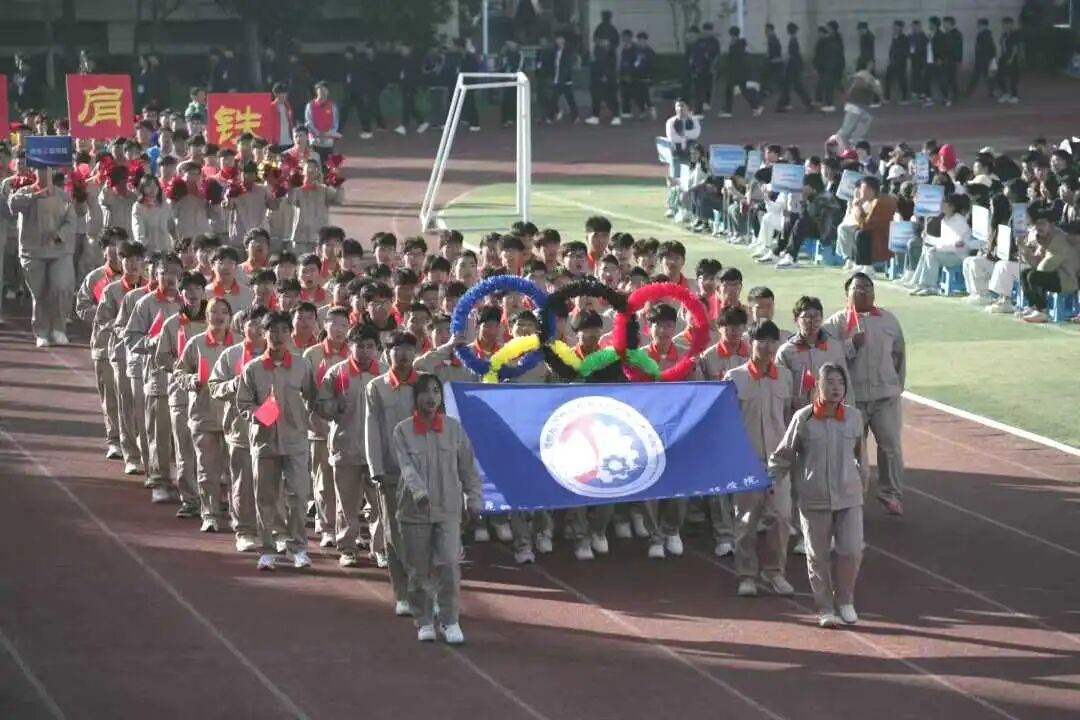 机电工程学院方阵以巧思呈现奥运五环造型,将体育精神与专业特色完美融合。五环闪耀,象征团结与卓越,呼应着“精益求精,机电先行”的口号,展现他们勇于创新、追求突破的工匠情怀。