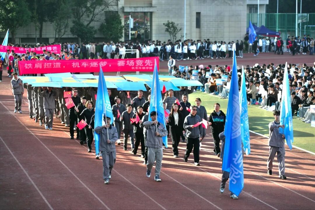 机车车辆学院方阵英姿飒爽,“铁肩担道,机车逐梦,赛场竞先”是他们的豪情。