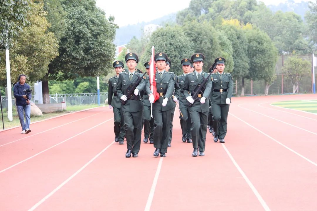 国旗护卫队以昂扬的精神、坚定的步伐护卫着国旗,迈向升旗台,在雄壮的国歌声中,五星红旗在师生的注目中冉冉升起,隆重而庄严。