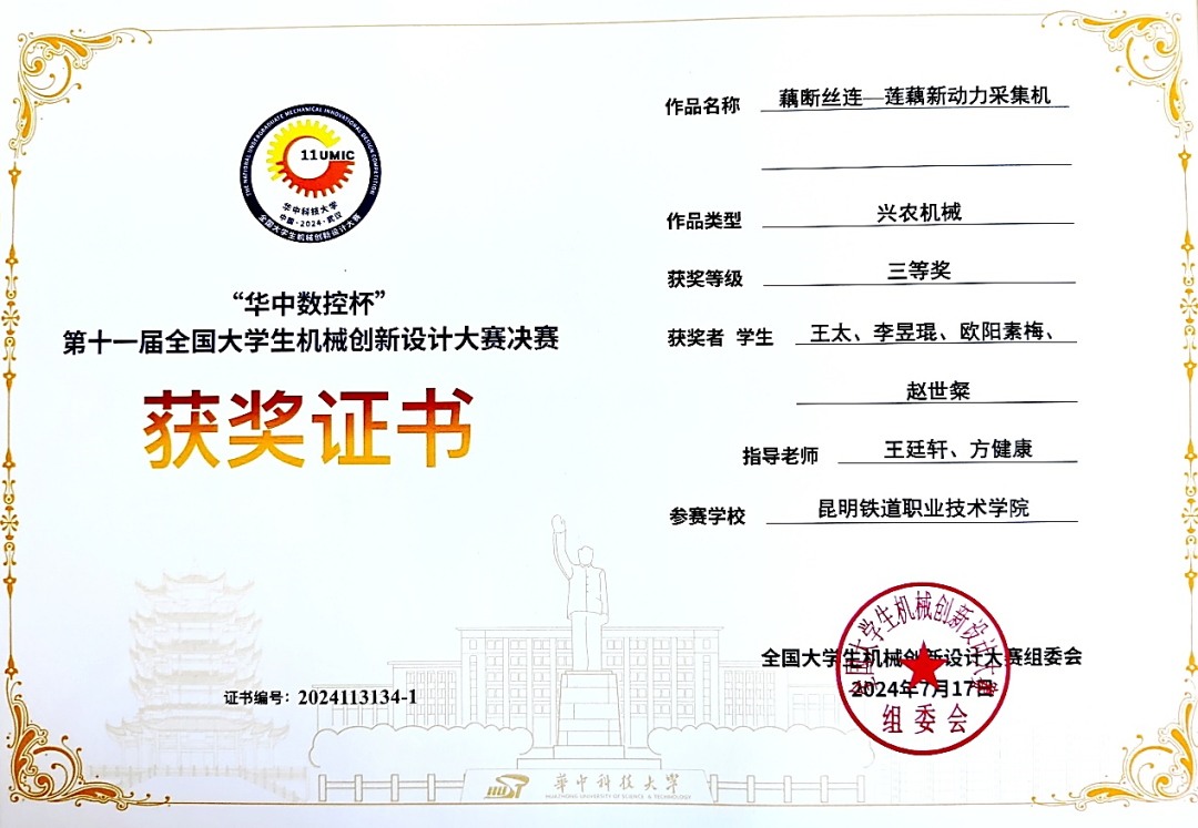 新葡萄机电工程学院机械基础教研室教师王廷轩、方健康两位老师指导王太、李昱琨、欧阳素梅、赵世粲4名同学代表学校参赛,参赛作品《藕断丝连——莲藕新动力采集机》获兴农机械组全国总决赛三等奖。