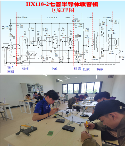 实训中过程中同学们根据老师的指导逐步进行焊接元件,认真细致完成每一个操作步骤,在收音机组装中,同学们基本都能组装调试成功,实现了收音机接收信号的功能,且接收到的信号清楚,声音洪亮。