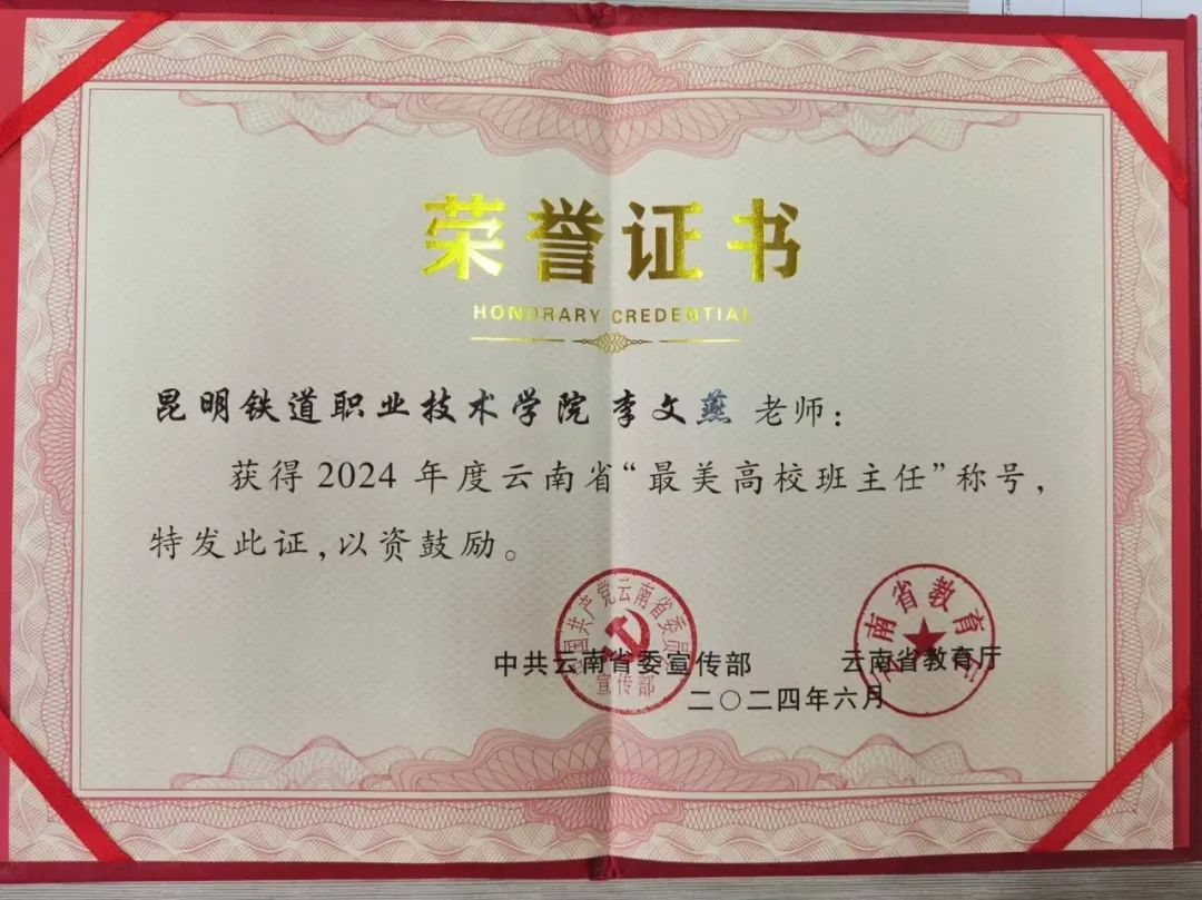 近日,中共云南省委宣传部、云南省教育厅公布《关于2024年度云南省最美高校辅导员和班主任、最美大学生推选结果的通知》,我院教师李文燕荣获2024年度云南省“最美高校班主任”称号。