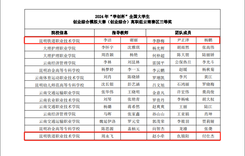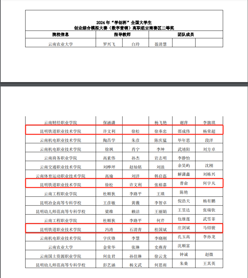 6月23日,第十一届“学创杯”全国大学生创业综合模拟大赛云南省选拔赛(高职组)在云南国土资源职业学院经开校区举行。高职组共有26所高职院校的216支队伍648名学生参赛,我院共有6支队伍18名学生进入省赛,荣获4个二等奖,2个三等奖。