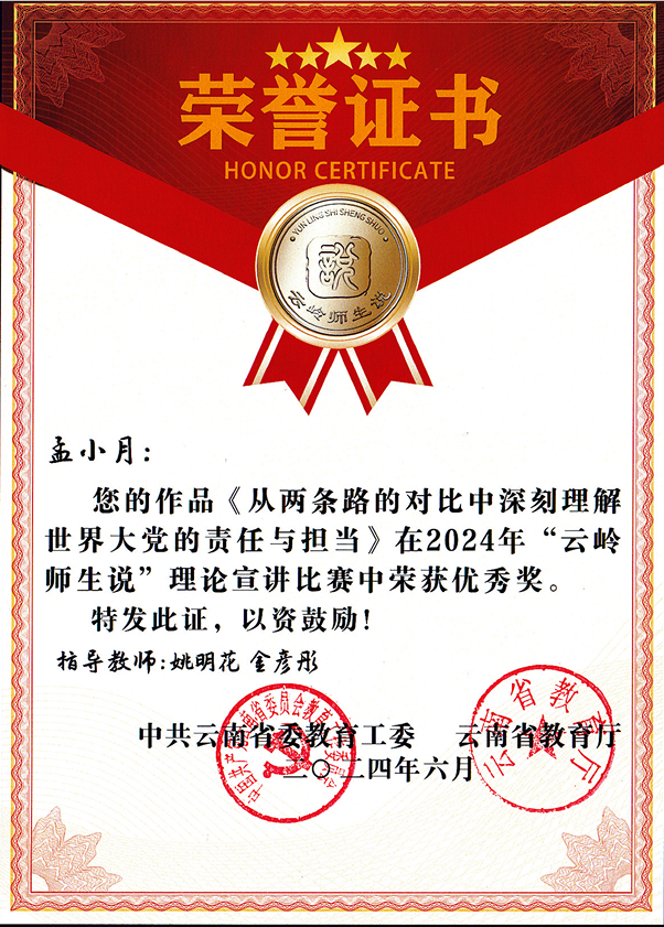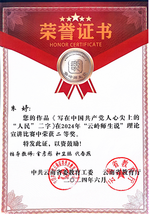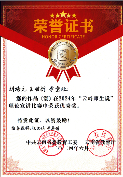 近日,云南省委教育工委、云南省教育厅公布 2024 年“云岭师生说”理论宣讲比赛结果,新葡萄朱婷老师在初赛选拔中脱颖而出,在现场决赛中,参赛作品《写在中国共产党人心尖上的“人民”二字 》以总分排名第三的优异成绩荣获语言类教师组二等奖;孟小月老师作品《从两条路的对比中深刻理解世界大党的责任与担当》荣获语言类教师组优秀奖;刘培元、王世衍、李垒旺三位同学作品《潮》荣获文艺类学生组优秀奖。