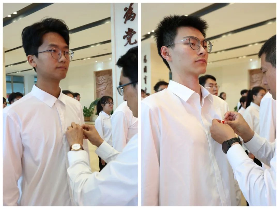学院组织部部长及各党支部书记为新党员代表佩戴党员徽章。