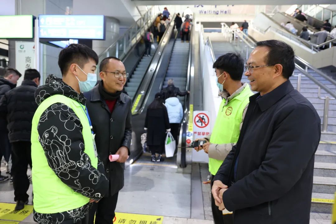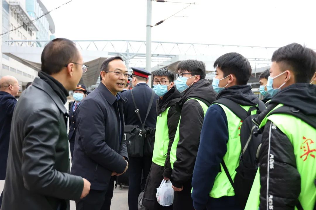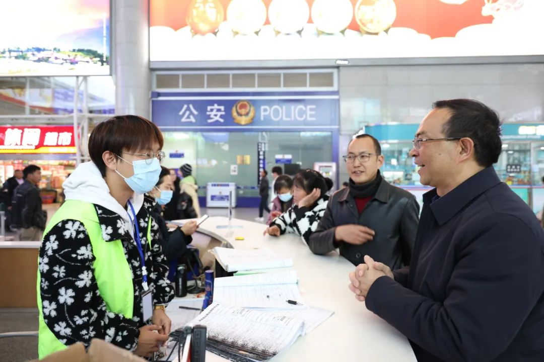 2月7日上午,学院党委书记王树华到昆明站对我院在本次春运实习中涌现出来的三名优秀实习志愿者同学表达祝贺及问候,同时对铁路站段给予学生的关心帮助表示感谢。并到各岗位看望在岗的实习同学,鼓励大家在实习过程中不断学习、不断历练,发扬“奉献、友爱、互助、进步”的志愿精神,用实际行动展现新时代铁路院校大学生的风采和担当。