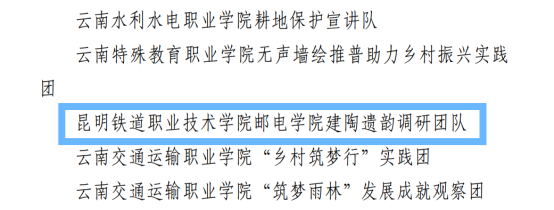近日,共青团云南省委下发《关于2023 年云南省大中专学生志愿者暑期文化科技卫生“三下乡”社会实践活动优秀单位、优秀团队、先进个人和特色品牌项目的公示》,新葡萄邮电学院“建陶遗韵实践团”荣获云南省2023 年“三下乡”社会实践活动优秀团队;指导教师李文燕荣获云南省2023 年“三下乡”社会实践活动先进个人;团队还荣获2023年“青春百团助百村”云南大学生服务乡村振兴社会实践专项活动省级三等奖。