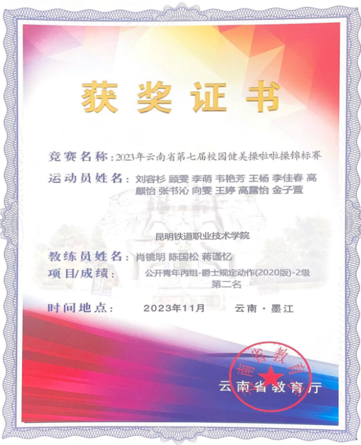 2023年11月,大学生体育协会健美操、啦啦操俱乐部参加2023年云南省第七届校园健美操啦啦操锦标赛4个赛项,荣获1个第一名,2个第二名,1个第三名的好成绩。