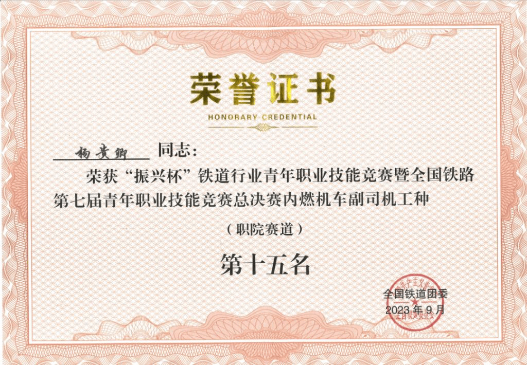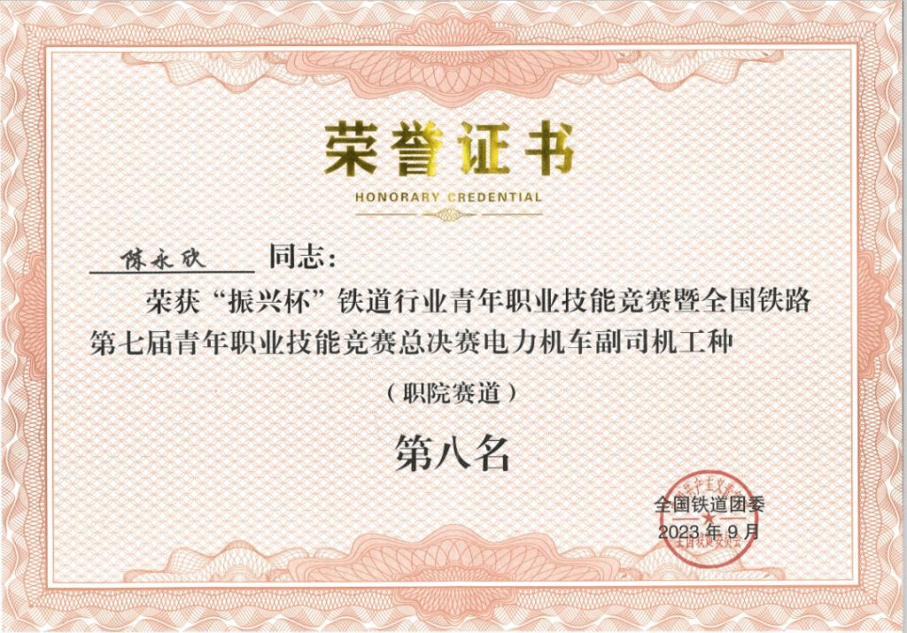 杨恩宇老师指导21级铁道机车1班杨浩楠、21级铁道机车2班陈永欣参加电力机车副司机工种(职教赛道)竞赛,参赛同学分别荣获第二名、第八名的好成绩。