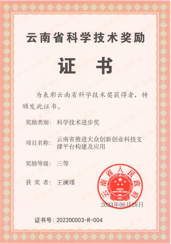 近日,云南省人民政府发布《关于2022年度科学技术奖励的决定》,对在云南省科学技术进步、经济社会发展中作出突出贡献的科学技术人员和组织给予奖励。由新葡萄王澜瑾老师作为主要研究成员、学院作为第二完成单位完成的《云南省推进大众创新创业科技支撑平台构建及应用》项目荣获云南省技术进步奖三等奖,为本次获奖单位中唯一一所职业院校,这也是新葡萄首次在科学技术领域获得的省级奖励。