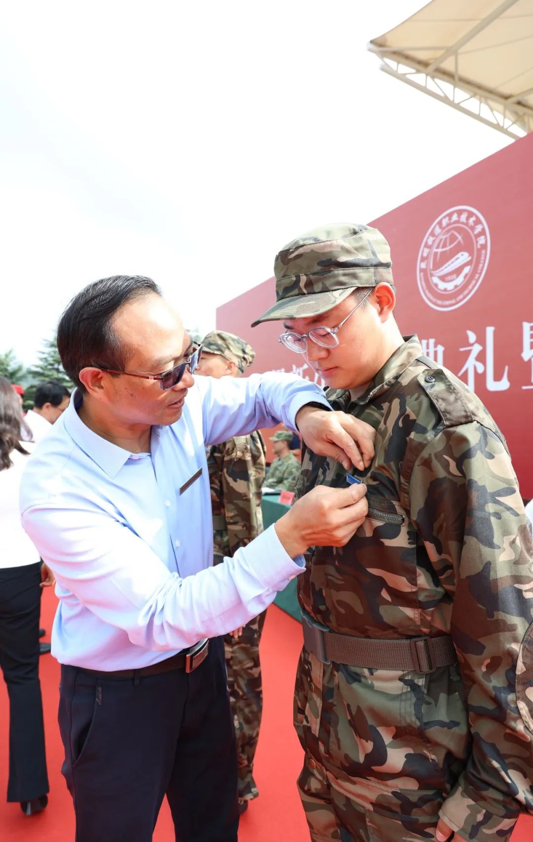 王树华为新生代表佩戴校徽。在羊甫校区分会场,副院长田效军为新生代表佩戴校徽。