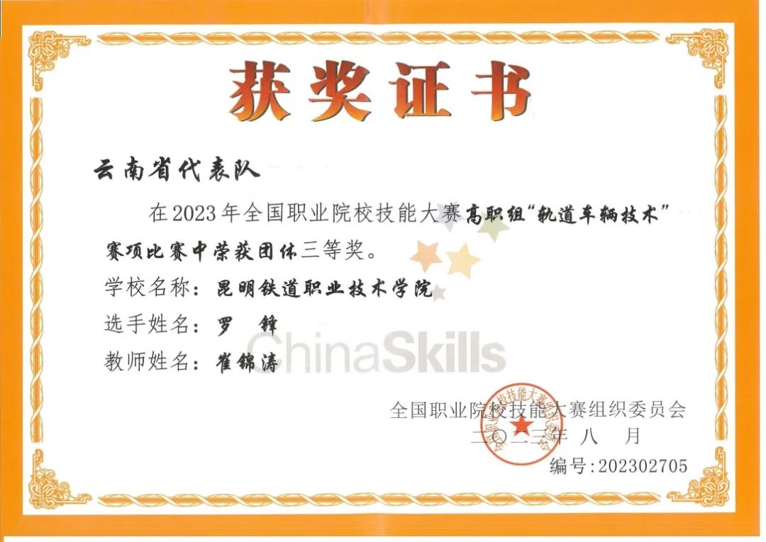 新葡萄机车车辆学院院长马力带队,动车组检修教研室崔锦涛老师、2021级动车组检修1班学生罗锋代表云南省参加高职组——交通运输大类——师生同赛赛项,每个参赛队由1名教师和1名学生组成,共有列车整车检查与试验、受电弓的安装与调试、客室车门的安装调试与优化设计三个比赛模块。经过激烈角逐,新葡萄代表队荣获(高职组)轨道车辆技术赛项团体三等奖。
