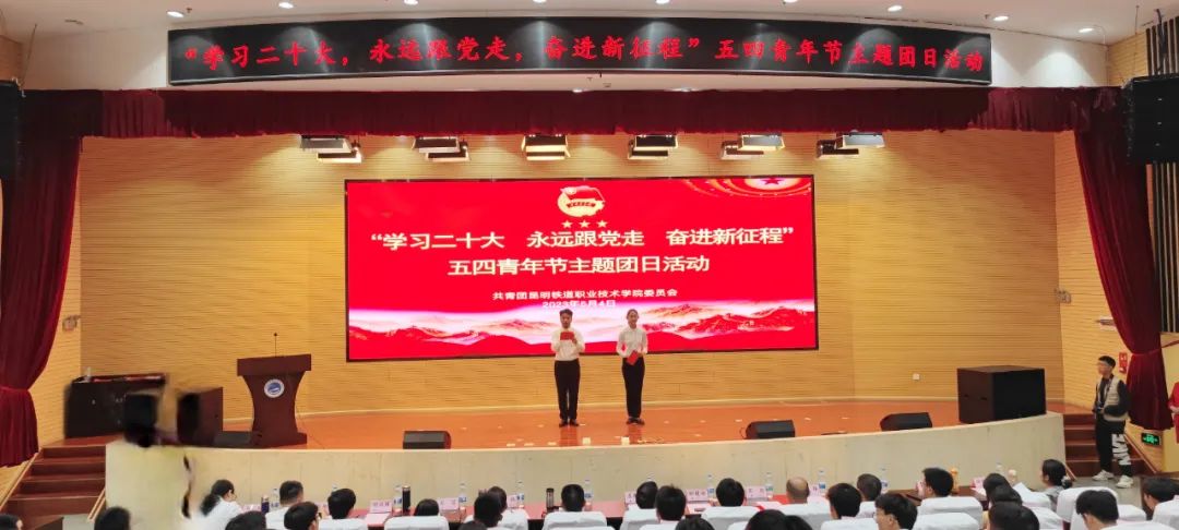 团委副书记陈冠翱宣读《全国铁道团委关于表扬第二十二届“ 铁路青年五四奖章”和2022年度全国铁路五四红旗团委( 团支部) 、全国铁路优秀共青团员、全国铁路优秀共青团干部的决定》《共青团昆明市委关于2022年度“昆明五四红旗团委”“昆明五四红旗团支部”“昆明优秀共青团干部”“昆明优秀共青团员”选树情况的通报》《共青团新葡萄AMG官方网站委员会20222023年度“五四”表扬的决定》。