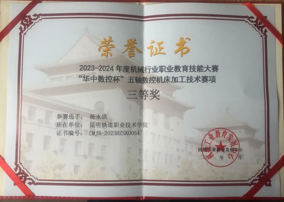 近日,2023-2024年度机械行业职业教育技能大赛“华中数控杯”五轴数控机床加工技术赛项在宜宾职业技学院举办,新葡萄机电工程学院装备制造教研室杨永洪老师在此次比赛中荣获三等奖。