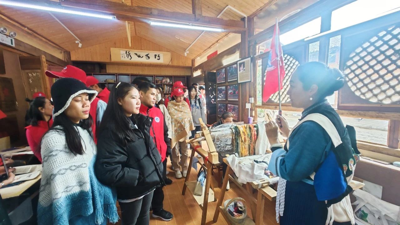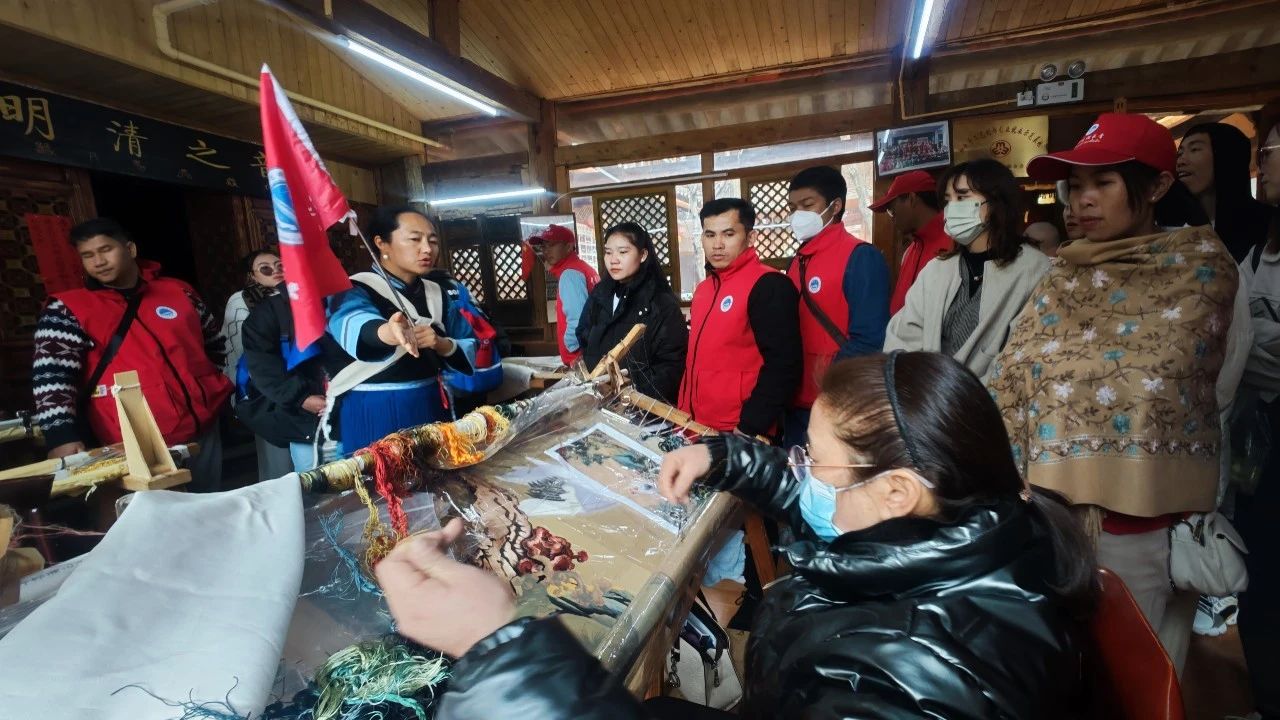老挝籍教师们走进白沙古镇的锦绣艺术院,听着纳西刺绣非遗传承人、有着 “云南民族民间刺绣高手”称号的熊老师细致的讲解,现场看着绣师们用平针、乱针、打籽针等针法绣制出各种精美图案,到展厅参观了上百幅精美的刺绣作品。老挝籍教师们对一幅幅栩栩如生的作品赞不绝口,作品中的山林田野和花鸟草虫都让大家看得目不转睛,感叹着这些绣师们用精美的作品传承着丽江少数民族刺绣文化,传承着祖辈智慧,传播着民族文化,蕴藏其中的匠心精神,更是让老挝籍学员深受感染。大家纷纷表示今后有机会一定要带家人再次来丽江,来感受这藏在市井生活中的中国民族文化。