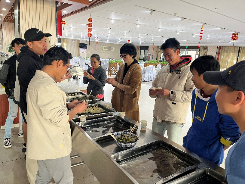 除夕当天,副院长邓正均率有关干部和教师到校,向在校过节的教师们致以新春问候和诚挚祝福,鼓励老挝学员好好学习、快乐生活,多体验中国文化,对一线工作人员付出的努力表示感谢,希望大家继续加强后勤保障和安全保障。同时,还组织老挝学员在田径运动场开展多项趣味活动。在餐厅,老师们带学员们动手包饺子,学员们认真地跟着老师们学习,拌肉馅,制作饺皮,认真体验每个步骤,忙得不亦乐乎,把对新年的美好愿望包进小小的饺子。动作越来越熟练,饺子形状越来越好。学院为学员们准备了丰盛的年夜饭,邓正均及学院教师与学员们共进晚餐,共话新春佳节,共叙学习和生活的趣事,共同祝愿美好的未来。