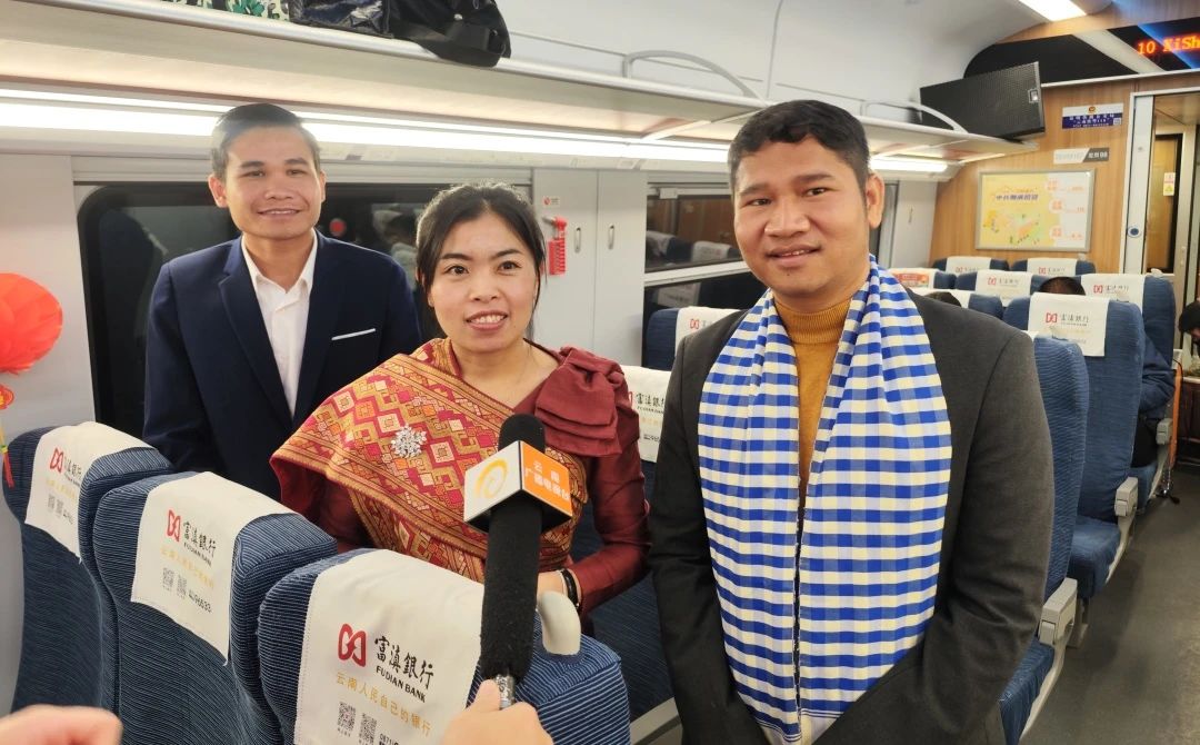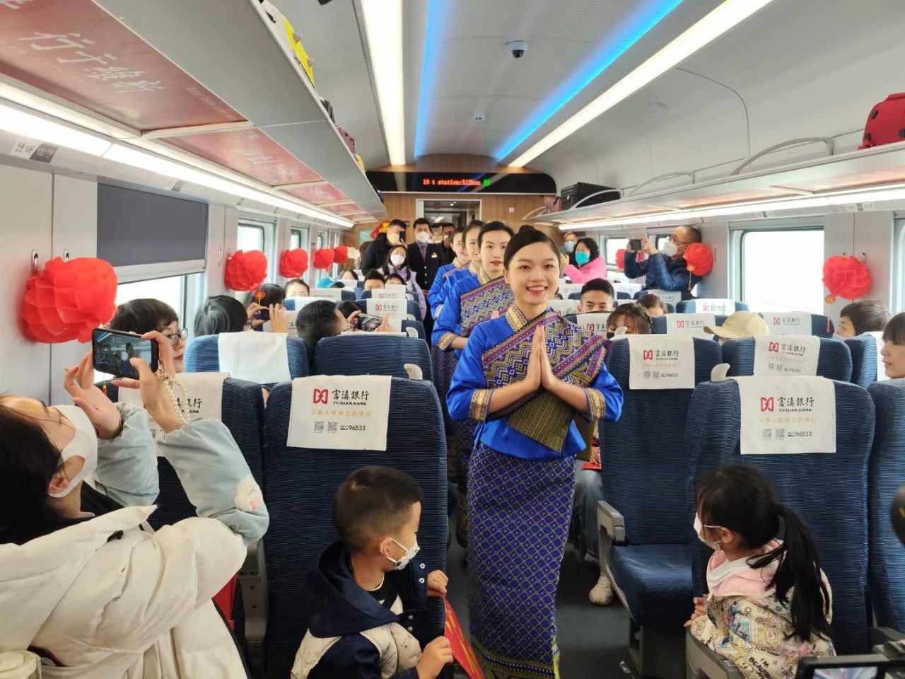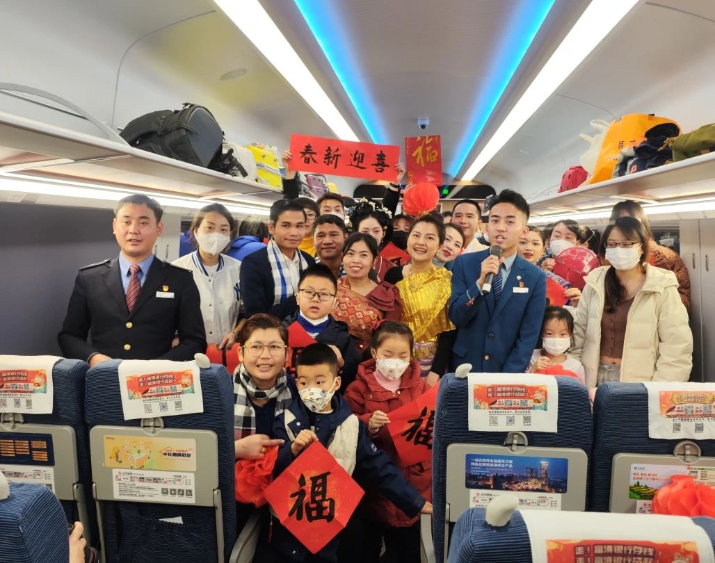 1月19日,受昆明铁路局邀请,在我院学习的老挝首批铁路教师代表李灵美、陈尚德、孙明凯参加了“中老一家亲,祥和中国年”为主题的中老铁路列车春晚活动。在昆明开往西双版纳的C272次动车上的10号车厢内,笑声欢快、掌声迭起,京剧表演、老挝舞蹈、傣族舞蹈、汉服展示、书法表演等精彩纷呈的节目在列车车厢过道里上演。