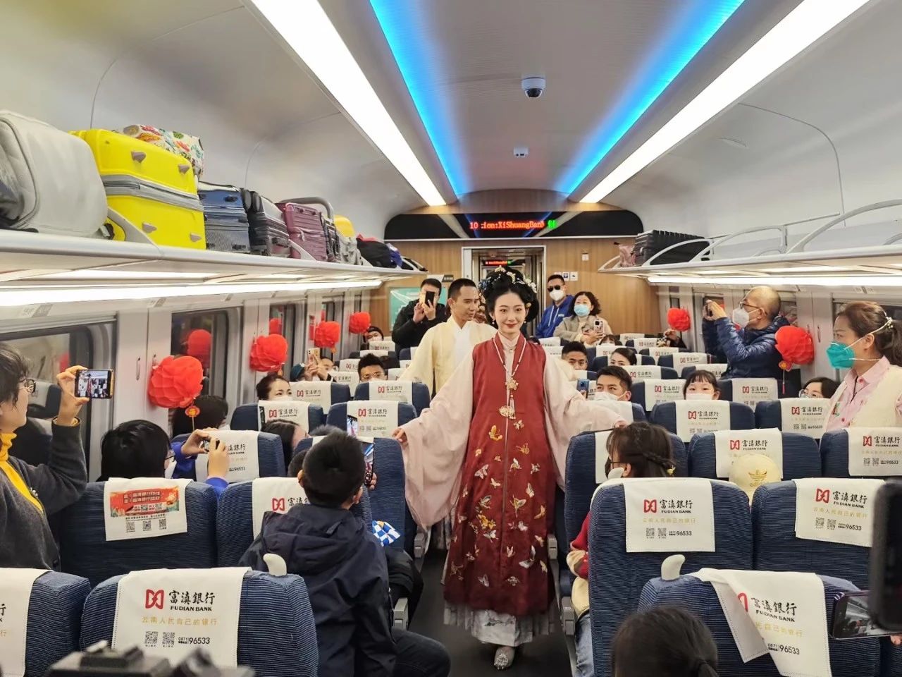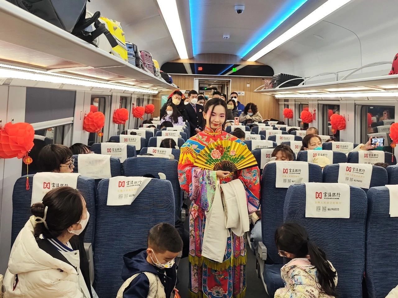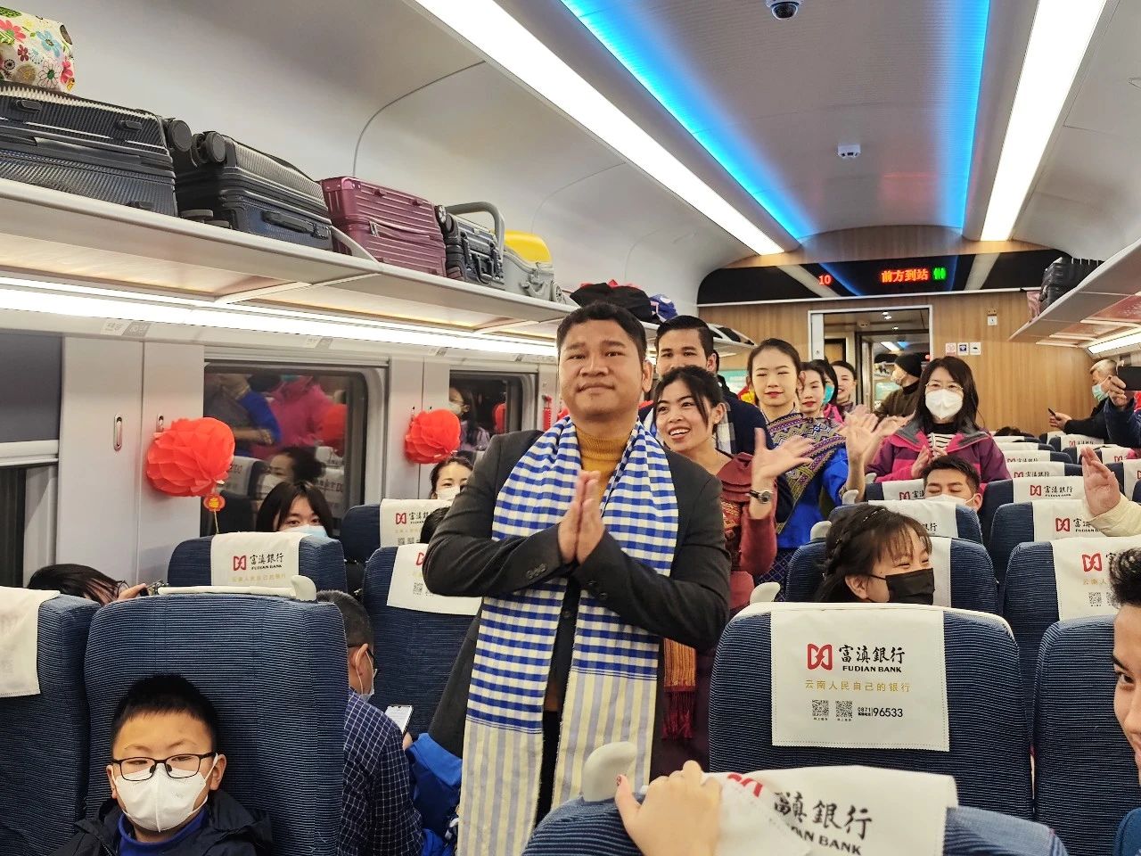 1月19日,受昆明铁路局邀请,在我院学习的老挝首批铁路教师代表李灵美、陈尚德、孙明凯参加了“中老一家亲,祥和中国年”为主题的中老铁路列车春晚活动。在昆明开往西双版纳的C272次动车上的10号车厢内,笑声欢快、掌声迭起,京剧表演、老挝舞蹈、傣族舞蹈、汉服展示、书法表演等精彩纷呈的节目在列车车厢过道里上演。