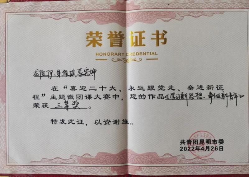 近日,共青团昆明市委组织开展了“喜迎二十大、永远跟党走、奋进新征程”主题微团课大赛。院团委、马克思主义学院共同组织开展了校级比赛,在 16件作品中推选出了3件作品代表学院参加市级复赛,最终电气工程学院代表队龙俊伊、朱佳琪、蒙宗坤同学作品《学习新思想,争做新青年》进入决赛并荣获三等奖。学院荣获“优秀组织奖”,龙俊伊同学被团市委聘为“春城青年讲师团”成员。