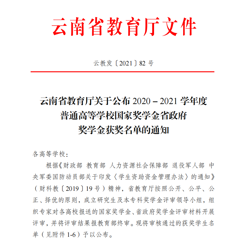 根据《云南省教育厅关于公布2020-2021学年度普通高等学校国家奖学金省政府奖学金获奖名单的通知》,新葡萄5名学生荣获普通高等学校本专科生国家奖学金,3名学生荣获普通高等学校本专科生省政府奖学金。